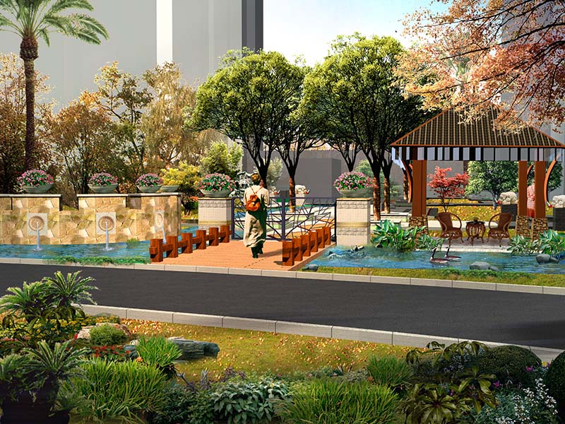 噴泉、神獸泉等多種水景景觀妝點(diǎn)園區(qū),賦予園區(qū)生動的氛圍和聲響;采用硬質(zhì)景觀點(diǎn)題,在主要節(jié)點(diǎn)設(shè)計(jì)神獸雕塑、花臺、燈飾、陶藝等小品突出東南亞特點(diǎn),
